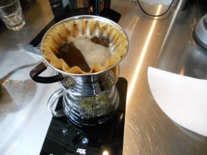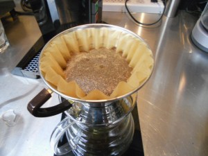 I decided to spend some time with the Kalita Wave this afternoon. First off I love the how the wave looks, its shiny stainless steel with ridges hence the wave I presume. It has a brown plastic handle with little brass embellishments. I’ve mainly done pour-overs with the Hario V-60 so this shiny device is a nice alternative. It has three ridges on the bottom of the inside to keep the filter from stopping the water flow. The water flow is slower than with a V-60 so I went two steps coarser on my grind. After side by side tasting the natural brown filter MUST be pre-washed.